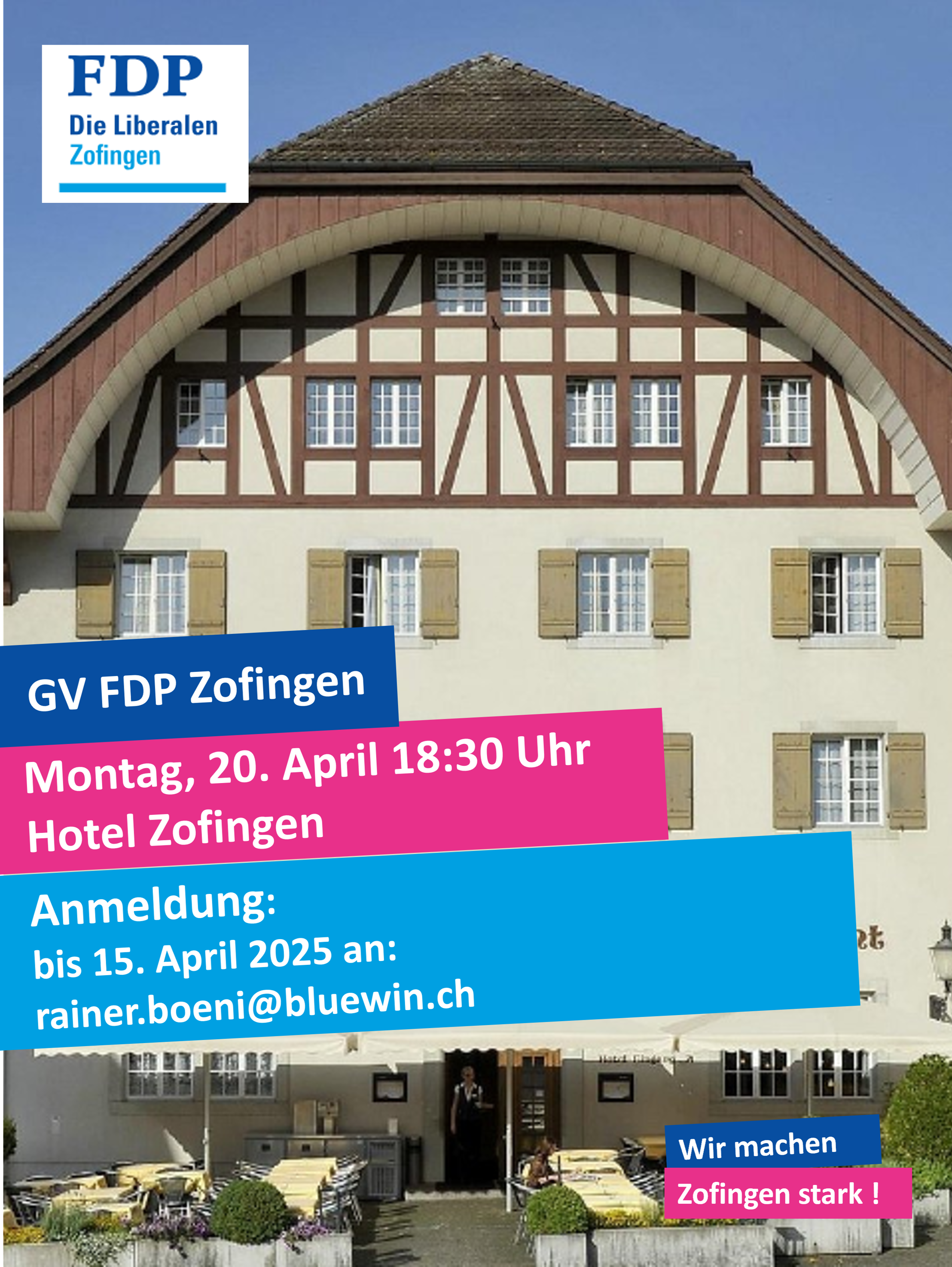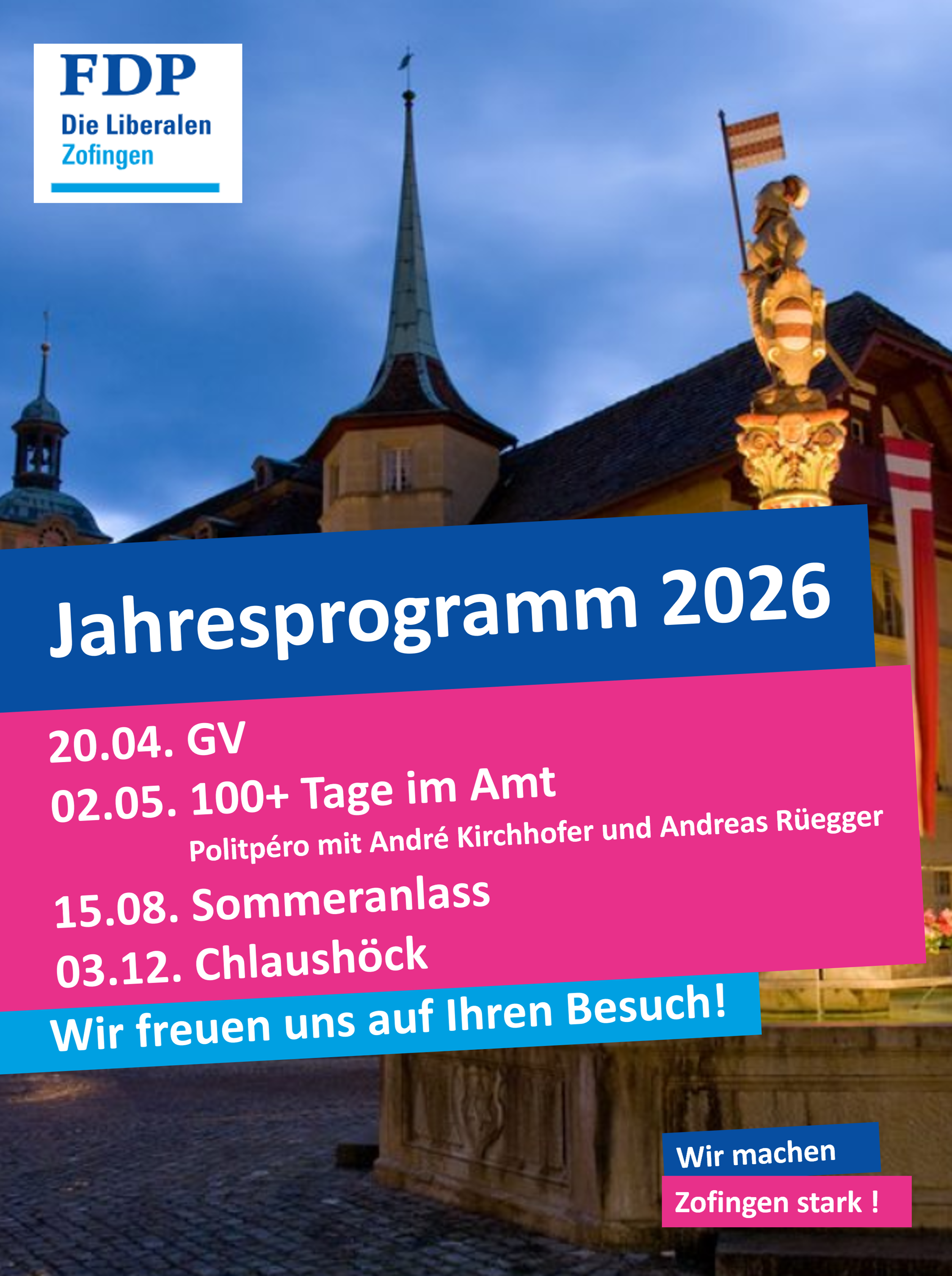 Wir freuen uns über Zuwachs! Die FDP. Die Liberalen Ortspartei Zofingen ist an der Gestaltung des politischen Lebens und somit am Gestalten des Zusammenlebens unserer Gesellschaft massgeblich beteiligt. Wenn das Tagesgeschehen oder strategische Prozesse unsere Aufmerksamkeit erfordern, handeln wir engagiert nach den freisinnigen Prinzipien zum Wohle der Stadt Zofingen.